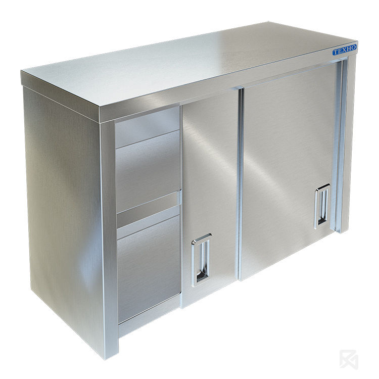 Полка настенная Техно ТТ ПН-124/1400 используется на предприятиях общественного питания для хранения посуды и кухонного инвентаря.Корпус изготовлен из нержавеющей стали AISI 304 толщиной 0.8 мм, две двери-купе, внутри полка, задняя стенка нержавеющая сталь марки AISI 430 толщиной 0,8мм.