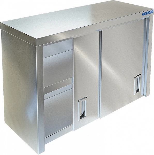 Полка настенная Техно ТТ ПН-124/2000 используется на предприятиях общественного питания для хранения посуды и кухонного инвентаря.Корпус изготовлен из нержавеющей стали AISI 304 толщиной 0.8 мм, две двери-купе, внутри полка, задняя стенка нержавеющая сталь марки AISI 430 толщиной 0,8мм.
