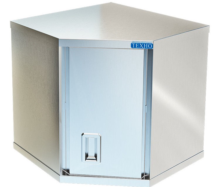 Угловая полка-шкаф цельносварная снабжена дверкой, позволяет создать линию полок и с пользой использовать угол помещения, внутри имеется одна полка, изготовлено все из пищевой нержавеющей стали (ПН-122 и ПН-124 нержавеющая сталь марки AISI 304, ПН-422 и ПН-424 нержавеющая сталь марки AISI 430). Полки с артикулом ПН-122 и ПН-422 имеют заднюю стенку из оцинкованного металла, полки с артикулом ПН-124 и ПН-424 имеет заднюю стенку из нержавеющей стали. Полка крепится к стене при помощи кронштейнов. Рекомендуем крепить полку к влагоустойчивым поверхностям.