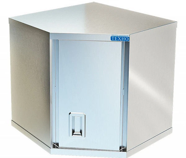 Полка настенная угловая сварная из нержавеющей стали марки AISI 304 толщиной 0,8мм, распашная дверка, внутри полка, задняя стенка оцинкованная сталь толщиной 0,55мм. Имеет накладки с вырезом "замочная скважина" для крепления к стене. Полка поставляется в собранном виде.