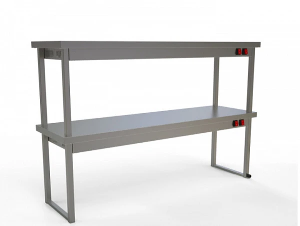 Полка настольная тепловая Кобор ПНТ/2-150/40 применяется в качестве вспомогательного звена линии раздачи. Полуфабрикаты и готовые блюда можно размещать на тепловой полке в столовой посуде либо гастрономических емкостях.