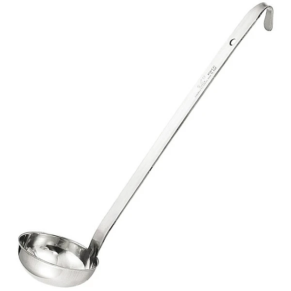 Изделие оснащено удобной длинной ручкой с крючком на конце. Половник имеет цельнотянутую конструкцию.