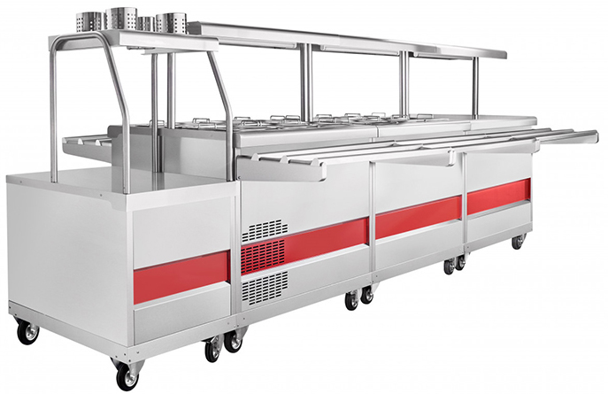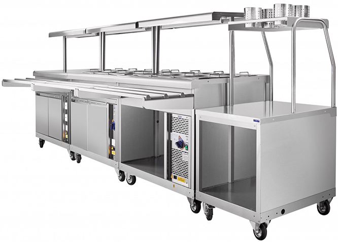 Прилавок холодильный Abat ПВВ(Н)-70ПМ передвижной используется в передвижной линии раздачи для нескольких задач: демонстрация и раздача холодных закусок, третьих блюд и охлажденных напитков потребителям, а также их хранение при заданной температуре.
