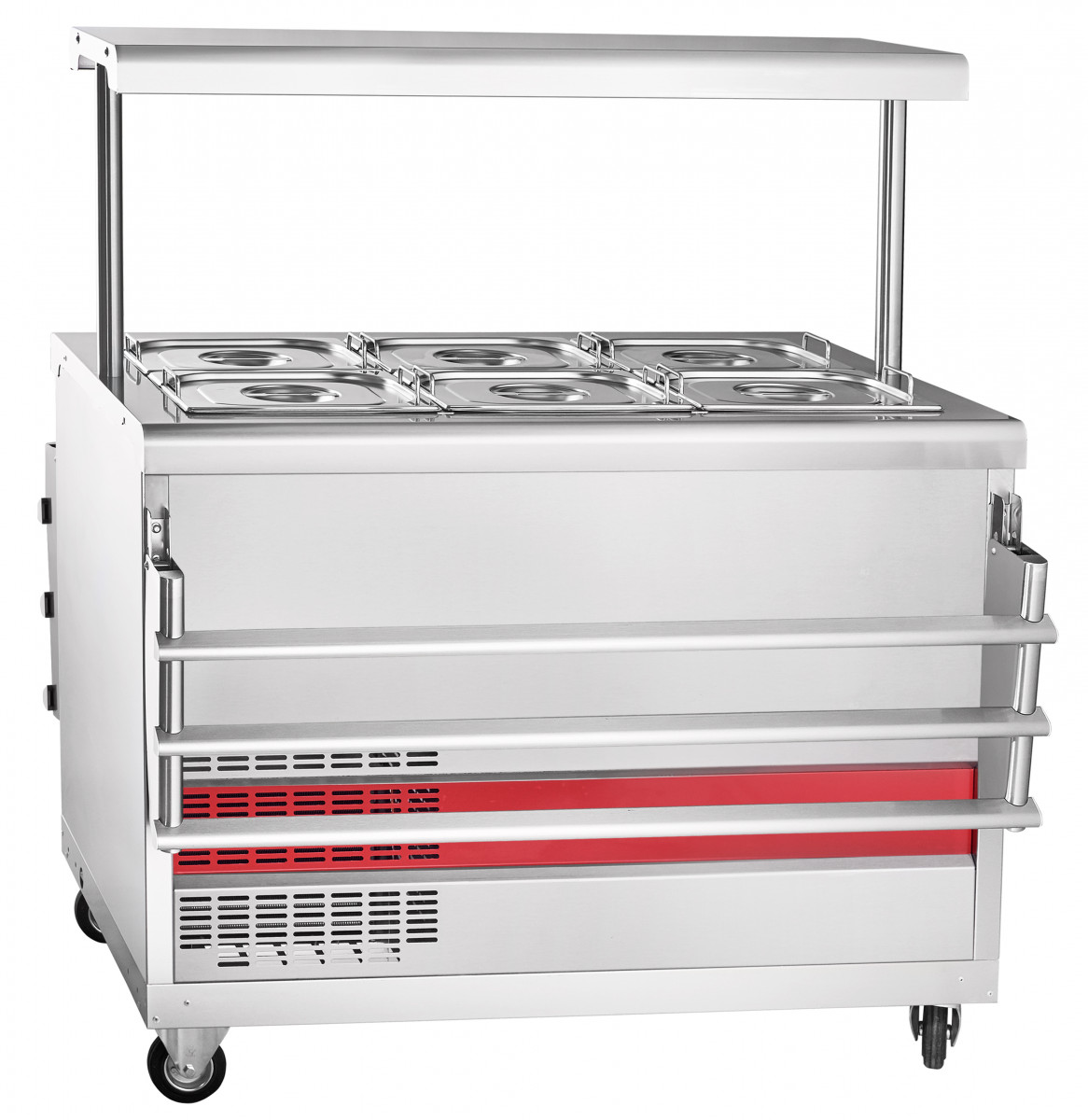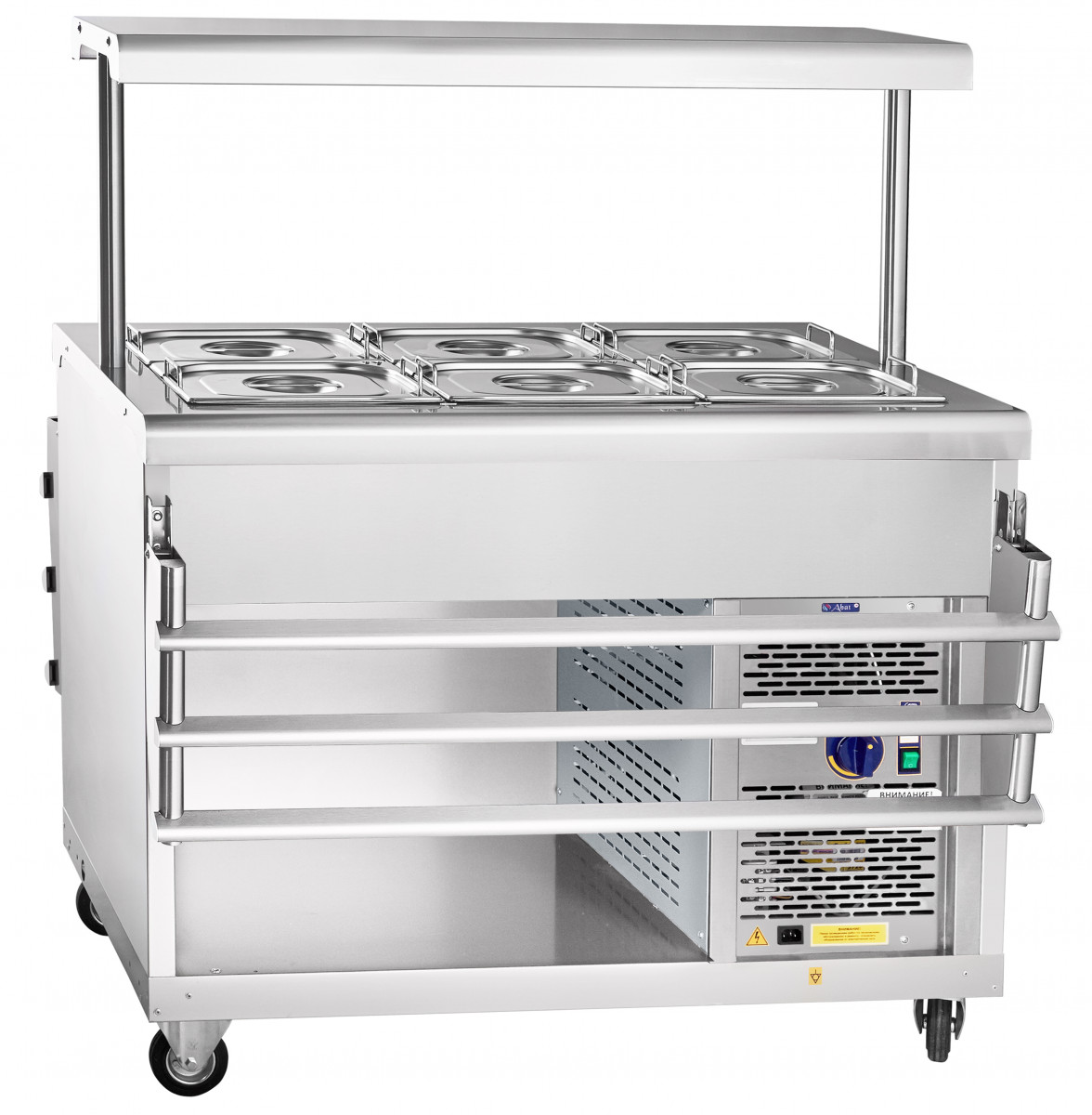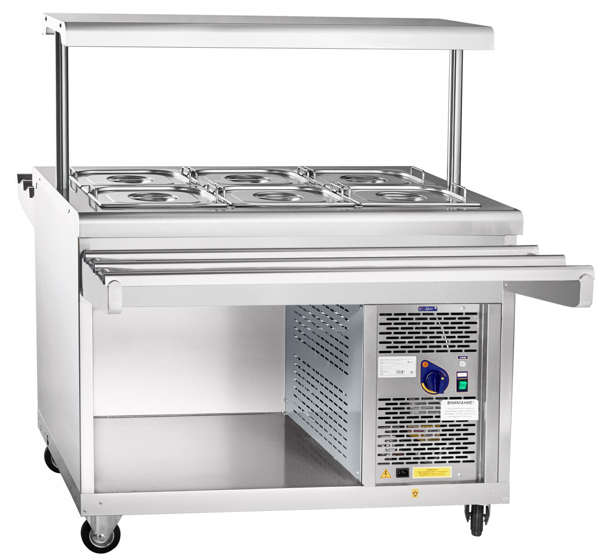 За счет поворотных колес со стопорным механизмом прилавок применяется при организации «мобильного» питания в гостиницах, ресторанах и буфетах.