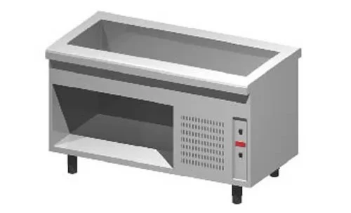 Поверхность прилавка выполнена из нержавеющей стали AISI 304 толщиной 15/10 со скруглёнными краями для комфортной эксплуатации и чистки. Охлаждаемая ванна также со скруглёнными краями подходит для гастроёмкостей GN 1/1 глубиной до 200 мм. Изоляция из высокоплотного вспененного полиуретана без C.F.C. и H.C.F.C. Регуляция температуры осуществляется с помощью цифровой программируемой панели управления. Под охлаждаемой ванной располагается нейтральный открытый шкаф.