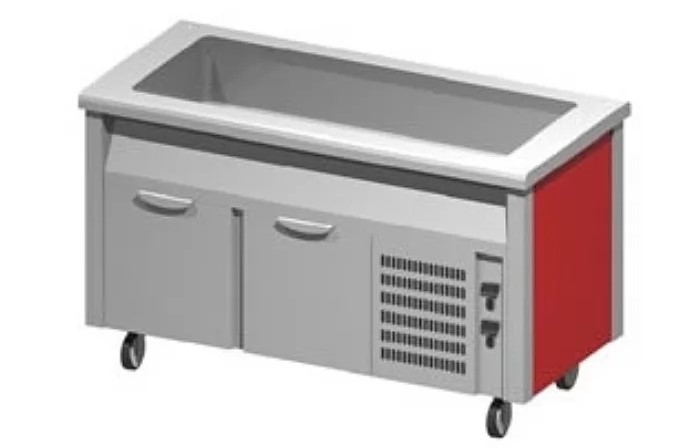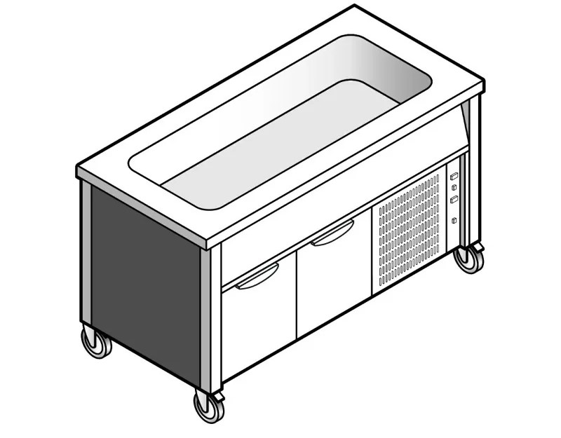 Поверхность прилавка высотой 50 мм выполнена из нержавеющей стали AISI 304 толщиной 12/10 со скруглёнными краями для комфортной эксплуатации и чистки. Охлаждаемая ванна также со скруглёнными краями подходит для гастроёмкостей GN 1/1 глубиной до 200 мм. Изоляция из высокоплотного вспененного полиуретана без C.F.C. и H.C.F.C. Под охлаждаемой ванной располагается охлаждаемый шкаф с дверцами на петлях. Регуляция температуры осуществляется с помощью независимых цифровых программируемых термостатов. Поставляется с направляющими для гастроёмкостей GN 1/1.