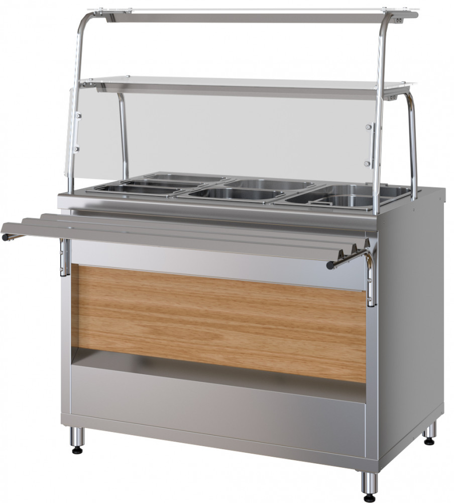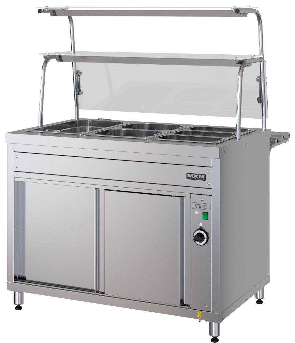 Прилавок-мармит вторых блюд Марихолодмаш ПМВЭ11 из линии раздачи питания "ШЕФ" 1120 из нержавеющей стали. Изделие относится к разряду профессионального кухонного оборудования и предназначено для поддержания установленной температуры вторых блюд, соусов, гарниров при кратковременном хранении в горячем состоянии в функциональных емкостях и раздаче их потребителям самостоятельно или в составе технологических линий раздачи.