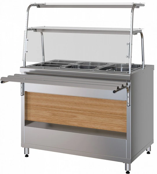Прилавок-мармит вторых блюд Марихолодмаш ПМВЭ15 из линии раздачи питания "ШЕФ" 1500 из нержавеющей стали. Изделие относится к разряду профессионального кухонного оборудования и предназначено для поддержания установленной температуры вторых блюд, соусов, гарниров при кратковременном хранении в горячем состоянии в функциональных емкостях и раздаче их потребителям самостоятельно или в составе технологических линий раздачи.