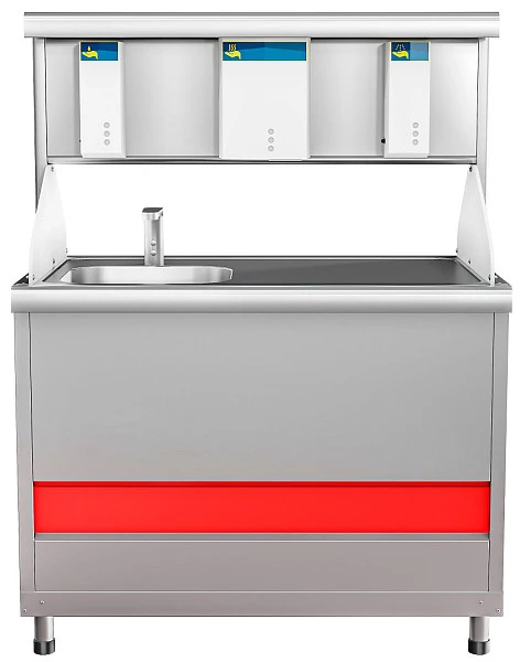 На столешницу корпуса установлена полка. На полке установлены автоматические бесконтактные электроприборы: дозатор жидкого мыла; электросушилка; дозатор антисептика.