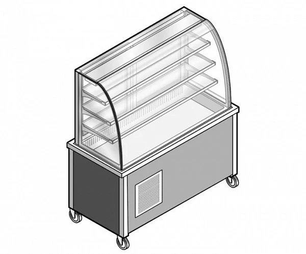 Поверхность прилавка высотой 50 мм выполнена из нержавеющей стали AISI 304 толщиной 12/10 с закруглёнными краями для удобной эксплуатации и чистки. Поток охлаждающего воздуха направлен снизу и охлаждает все полки. Регулируемое по высоте дно из нержавеющей стали (высота регулируется в диапазоне от 30 до 80 мм). Имеется испаритель с антикоррозийным покрытием, который можно поднять для лёгкой гигиенической обработки охлаждаемой ванны. Изоляция из высокоплотного вспененного полиуретана без C.F.C. и H.C.F.C. Витрина оснащена дверцами-купе со стороны продавца, имеется LED-подсветка. Настройка температуры и режима разморозки осуществляется с помощью цифровой программируемой панели управления. Под витриной располагается открытый нейтральный шкаф, который позволяет существенно экономить рабочее пространство и организовывать хранение.