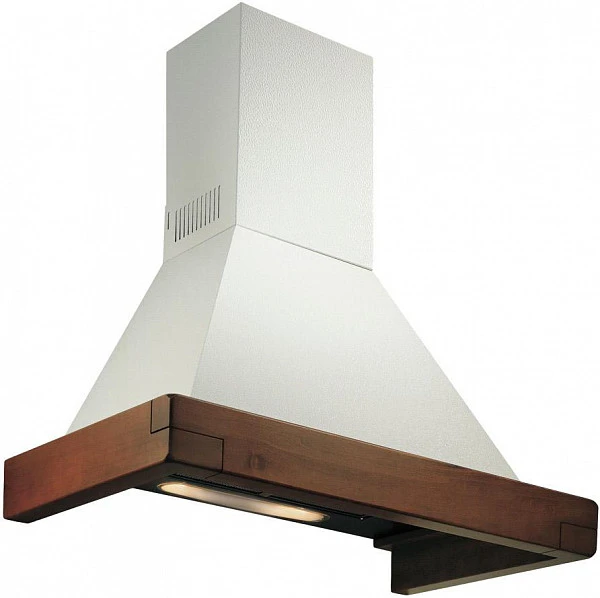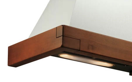 Вытяжка в элегантном белом цвете и окантована рамой из массива дерева оттенка «орех».