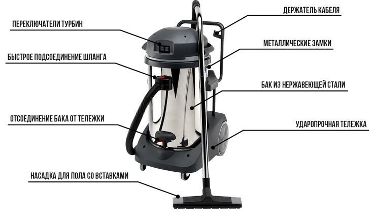 Пылесос способен одинаково легко втягивать как сухой мусор (бетонную пыль, песок, сыпучие смеси, кирпичную крошку, осколки стекла, металлическую стружку и т.д.), так и разного рода жидкости.