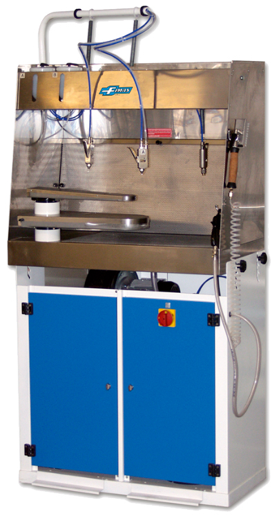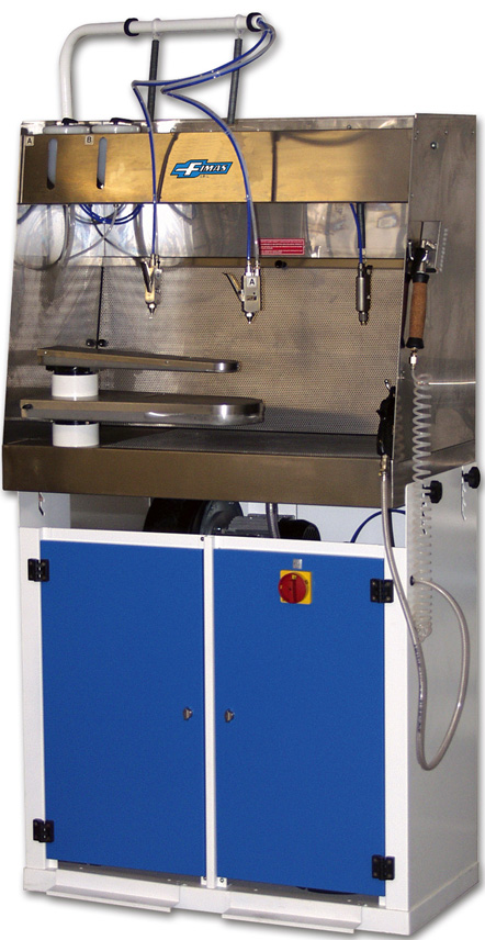 Шкаф укомплектован двумя пистолетами для реагентов и воздуха, одним дополнительным - для мыльного раствора, а так же специальной щеткой с подводом мыльного раствора для более интенсивной обработки пятен.