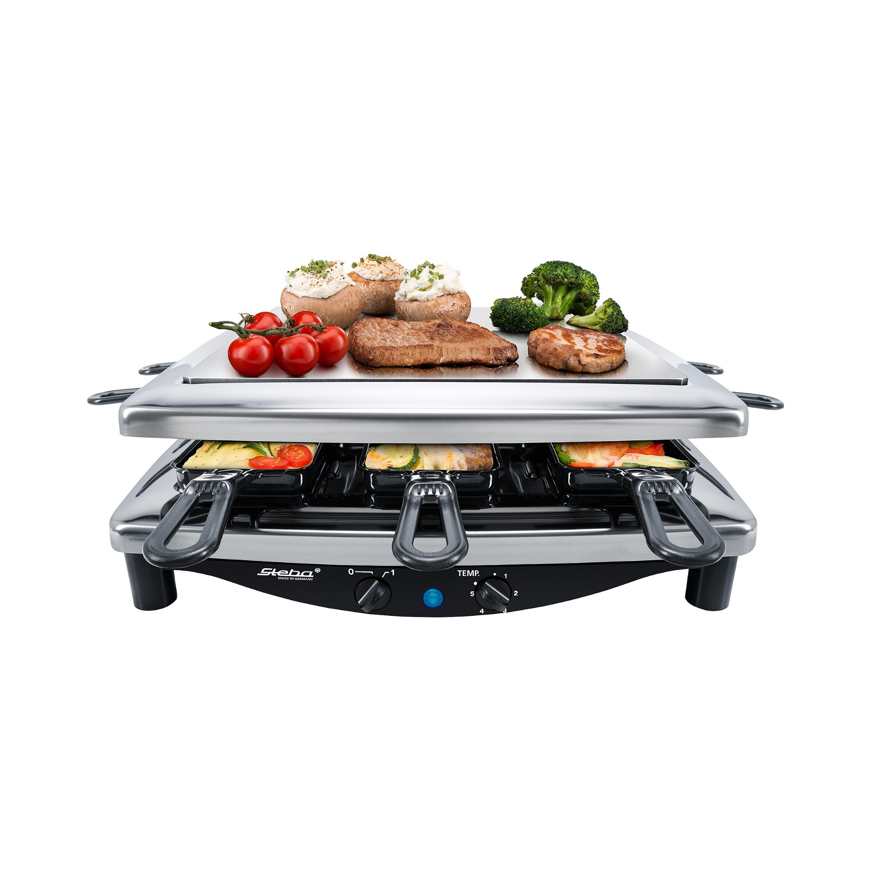 Раклетница Steba RC 7 Steel De Luxe предназначен для жарки мяса, рыбы и овощей с одновременным плавлением сыра в частных домах, квартирах, отелях и офисах. Модель оснащена панелью управления с поворотными регуляторами, светодиодным индикатором работы и съемными пластинами для гриля.