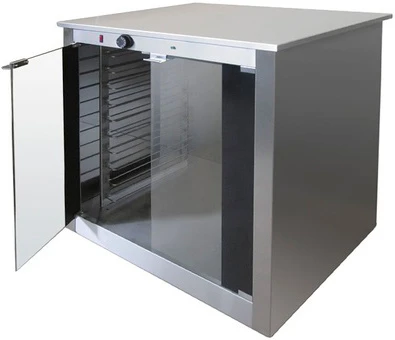 Расстойка выполнена в виде шкафа из нержавеющей стали со стеклянными дверьми.