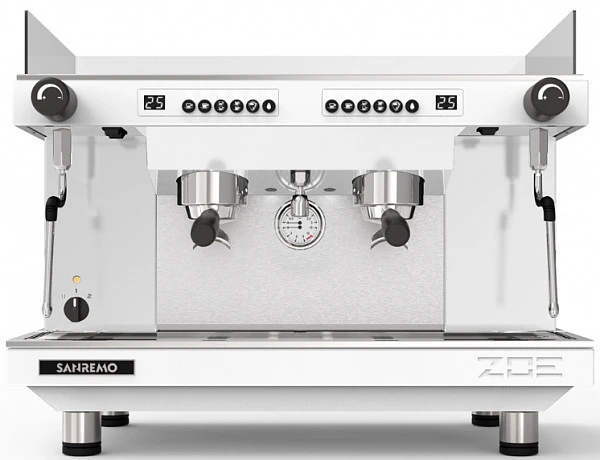 Рожковая кофемашина Sanremo Zoe Competition SED 2GR белая используется в кафе, ресторанах, кофейнях и барах для приготовления различных напитков на основе кофе.