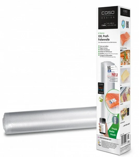 С рулонами для вакуумирования обеспечивается удобное хранение свежих овощей и фруктов, неиспользованных продуктов, полуфабрикатов, маринование мяса и рыбы, создание заготовок. В комплекте 2 рулона размером 40х1000 см, а также стикеры с QR-кодом. При помощи приложения «Caso Food Manager» Вы всегда сможете контролировать количество продуктов в холодильнике, а также сроки их хранения.