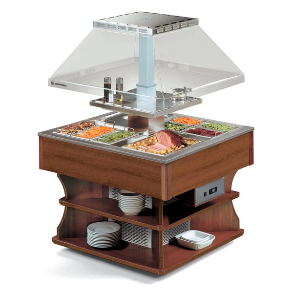 Салат-бар тепловой Tecfrigo OASI 4 M темный орех предназначен для демонстрации и поддержания в горячем состоянии первых и вторых блюд, гарниров, соусов, а так же для установки в линию самообслуживания в столовых, кафе, ресторанах, отелях, при организации банкетов и выездного питания.