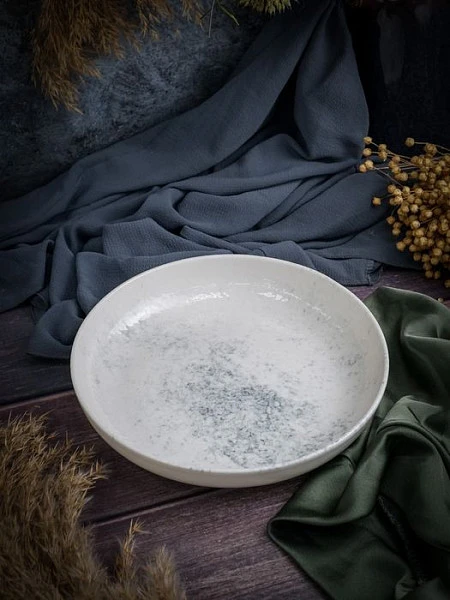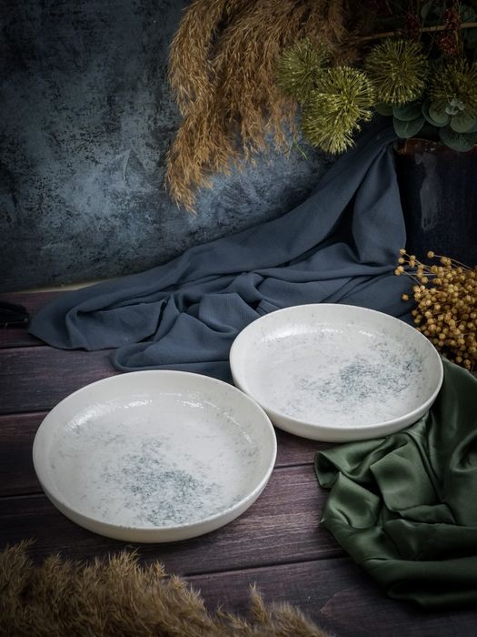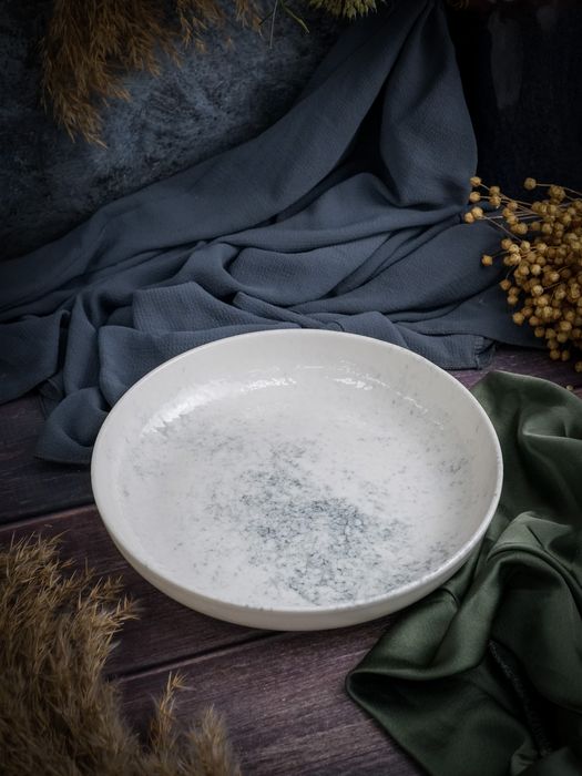 Фарфор этой коллекции молочного цвета глазури с дымчатым эффектом серо-синего напыления, с особой текстурой, декор имеет рельефную структуру поверхности.