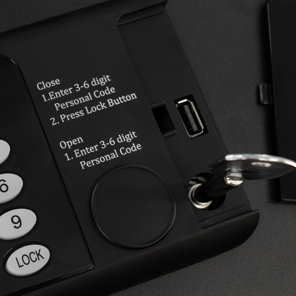 В случае, если установленные в сейфе батарейки разрядились и Вы не успели их заменить — на лицевой панели сейфа есть USB-разъём для подключения внешнего блока электропитания. Нужно подключить этот блок и открыть сейф пользовательским или мастер кодом.