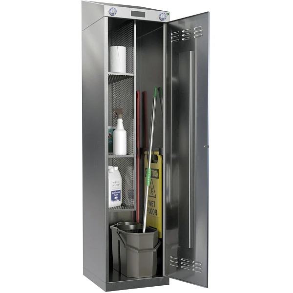 Шкаф для хранения и сушки уборочного инвентаря Atesy ШХСИ-1-02-1 предназначен для сушки инвентаря теплым обеззараженным при помощи ультрафиолетового излучения воздухом на предприятиях пищевых отраслей промышленности и общественного питания.