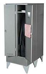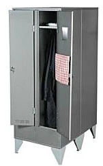 Каждая секция имеет запираемую дверь с вентилируемыми отверстиями, полку для головных уборов,перекладину для плечиков и прочей одежды, полку для обуви.