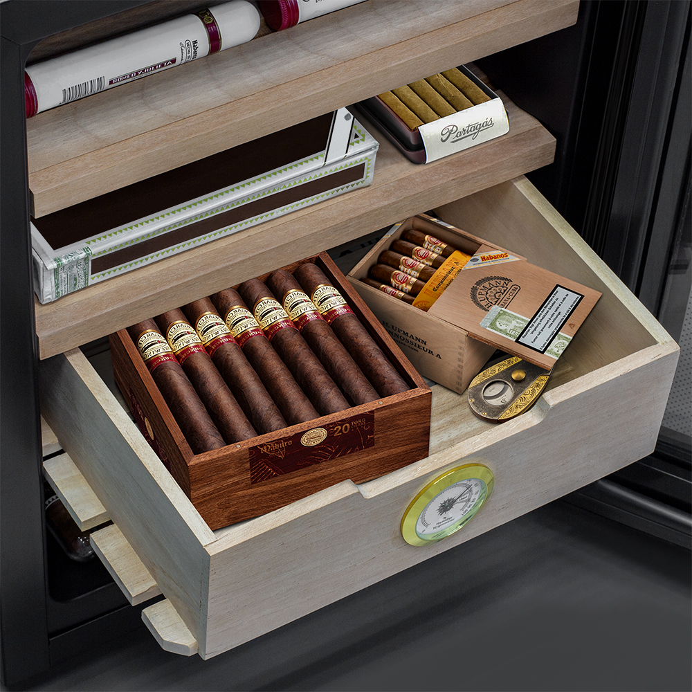 Компактный размеры делают возможной установку, практически в любом желаемом Вами месте. При небольших размера объём составляет 33 литра и позволяет хранить большую коллекцию сигар. В комплекте идут 2 полки и выдвижной ящик, которые можно располагать на разных уровнях. Полки и ящик изготовлены из дерева испанского кедра - отлично подходят для поддержания оптимального уровня влажности и не портятся во время эксплуатации. Дверца с двойным стеклом имеет защиту от УФ лучей и не пропускает излишнего излучения.