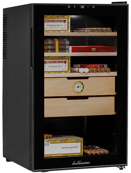 В ящике хьюмидора Meyvel MC-70BT встроен гигрометр, с помощью которого удобно отслеживать уровень влажности. Панель управления с электронным дисплеем позволит настроить необходимую температуру в диапазоне от +10C° до +18C°, включить или отключить внутреннее освещение. Уровень шума не превышает 41дБ.