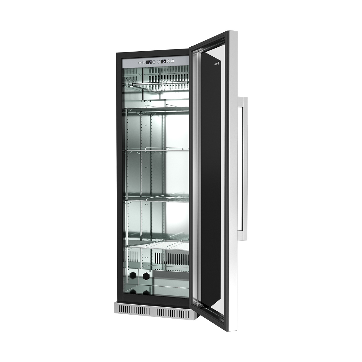 Мясо ферментируется в идеальных условиях: в камере для хранения легко установить нужную температуру (2-14 С) и влажность (50-85%). Воздействие вредоносных бактерий блокирует мощная УФ-лампа.