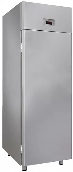 Шкаф обеспечивает поддержание температуры в пределах от -2 до +8°С, что оптимально подходит для хранения мяса, рыбы и полуфабрикатов. Имеет динамический тип охлаждения и автоматическую систему оттайки с испарением конденсата. Холодильный агрегат находится в отдельном отсеке. Внутри шкафа расположен воздухоохладитель с вентиляторами, которые обеспечивают равномерное распределение холодного воздуха внутри полезного объема шкафа. У холодильника одна дверца, которую можно перенавешивать, меняя направление ее открывания. Герметичный корпус и все конструктивные элементы шкафа изготовлены из нержавеющей стали.