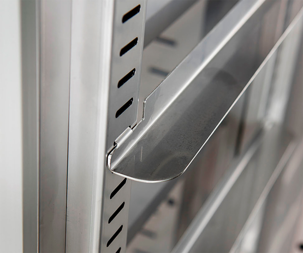 Шкаф имее моноблочную конструкцию с толщиной изоляции 70 мм из полиуретана высокой плотности и изготовлен полностью из нержавеющей стали AISI 304 18/10. Штампованное дно с округлыми углами для легкого ухода, равномерное распределение воздуха внутри камеры благодаря техническим особенностям парогенератора, контроль влажности с помощью сенсорной панели.