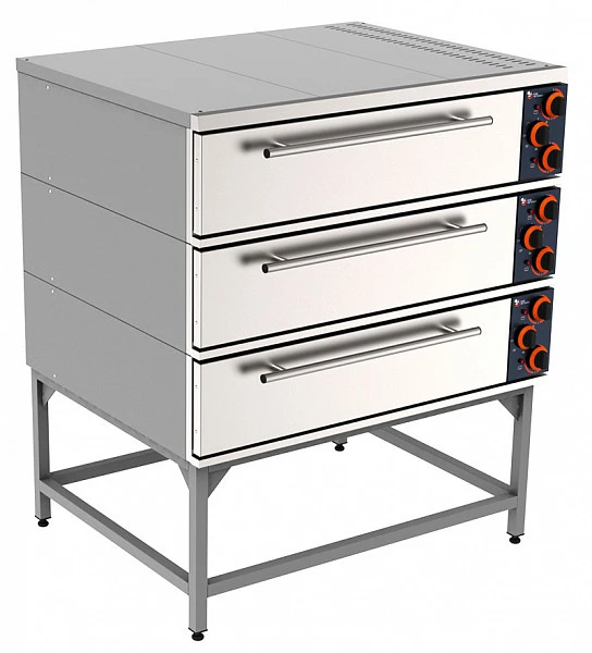 Шкаф пекарский электрический имеет модульную конструкцию в виде подставки, нескольких духовых шкафов и крышки (поставляется в собранном виде). Подставка выполнена из профильной трубы 40х40 и окрашена порошковой краской серого цвета.