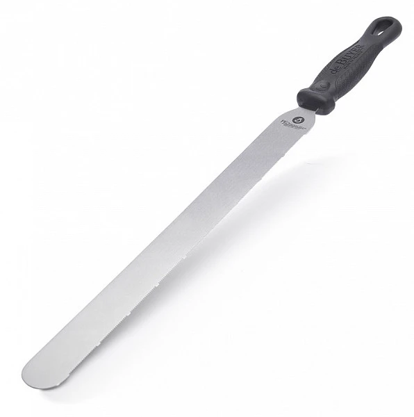 Шпатель кондитерский прямой с пилкой De Buyer 4234.35 используется на предприятиях общественного питания и торговли, а также в домашних условиях для ровной нарезки бисквита, без крошек, чтобы затем наполнить торт кремом или другой начинкой.