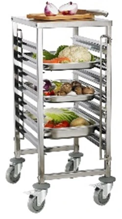 Тележка-шпилька Kocateq TR7 предназначена для хранения и перемещения гастроемкостей, минимизации занимаемой площади и оптимизации доступа к хранимым продуктам или материалам на кухнях предприятий общественного питания. Передвижной стеллаж состоит из многоярусных направляющих, укрепленных на стойках.