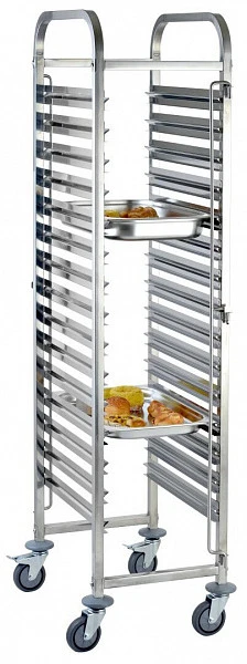 Тележка для гастроемкостей Viatto RT1115 используется для транспортировки продуктов, полуфабрикатов и готовых блюд на предприятиях общественного питания, пекарнях и кондитерских цехах.