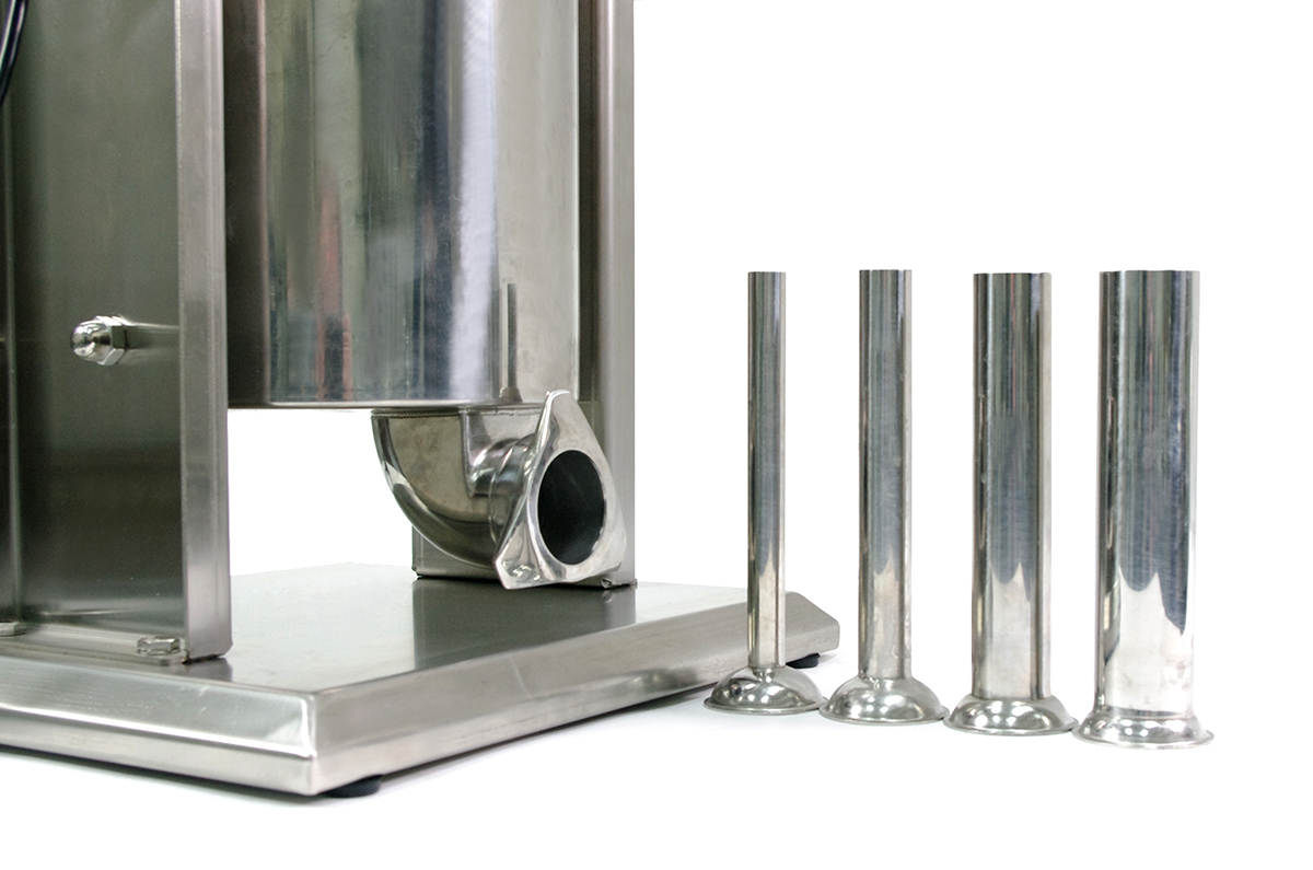 Три воронки-цевки из нержавеющей стали с входным диаметром 22, 32, 38 мм и ножная педаль.