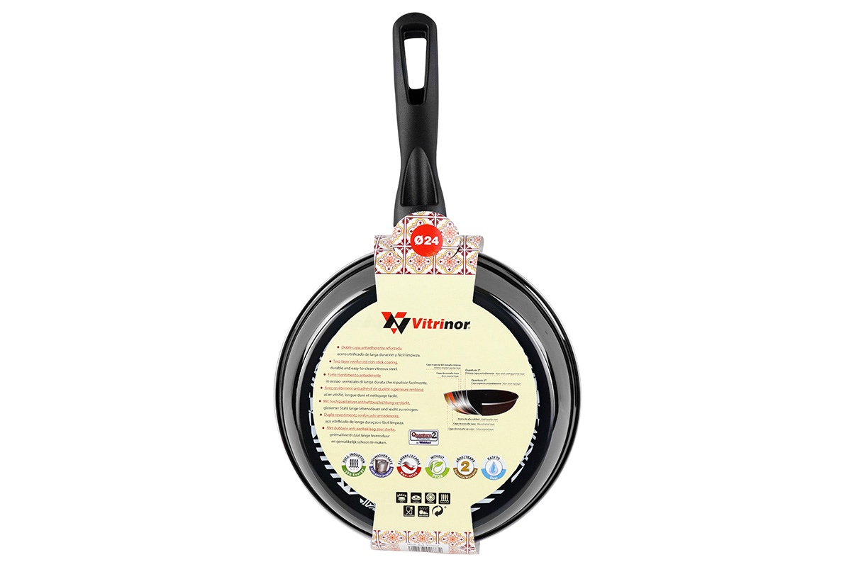 Внешнее покрытие из двухслойной стеклоэмали, обожжённой при температуре 820ºC, обеспечивает простой уход за сковородой, а яркие цвета посуды Vitrinor украсят интерьер любой кухни.
