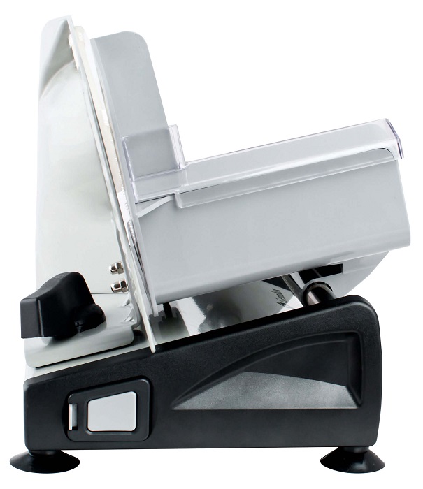 • Слайсер оснащен ножом диаметром 190 мм из нержавеющей стали с прямым лезвием и кареткой из пластмассы с гигиеничной накладкой из нержавеющей стали.