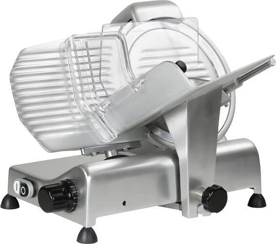 Слайсер Rgv Dolly 220/S Prof предназначен для нарезки мяса, сыров, рыбы, хлеба и других гастрономических изделий на ровные ломтики на предприятиях общественного питания, торговли и пищевой промышленности. Модель оснащена наклонным дисковым ножом. Лезвие выполнено из закаленной шлифованной стали с твердым хромированным покрытием, основание, крышка ножа, лоток для продуктов, перегородка для регулировки нарезки и фиксированное защитное кольцо лезвия – из анодированого алюминия с полированным покрытием, защитный экран – из плексигласа.