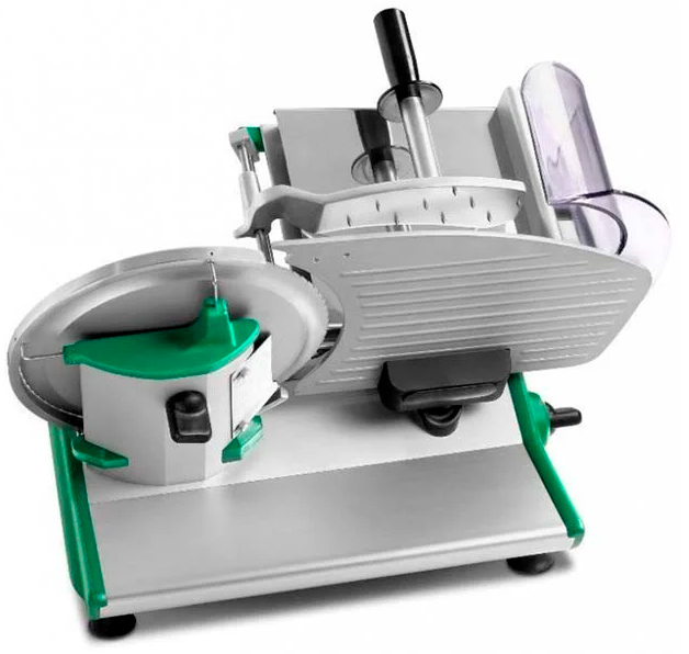 Слайсер работает в полуавтоматическом режиме. Наклонная каретка возвратно - поступательным движением толкается по направлению к вращающемуся дисковому ножу. Продукт, закрепленный на продуктовом столе каретки держателем, под действием сил гравитации давит на нож, что способствует очень быстрой, эстетичной и экономной нарезке.