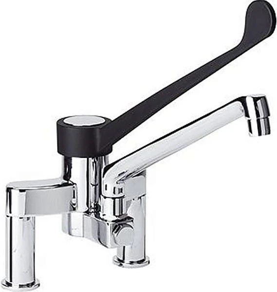 Модель устанавливается на кухонную мойку, оснащена удлиненным рычагом черного цвета и компактным изливом.