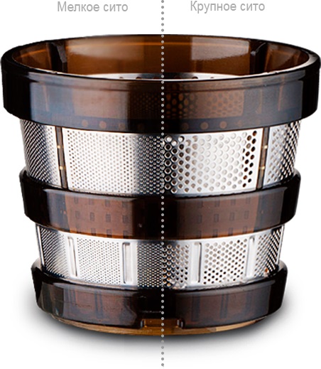 Мелкое и крупное сито. Благодаря размеру в 0.33 мм, сито эффективно отделяет твердые частицы от чистого сока, улучшая его текстуру.