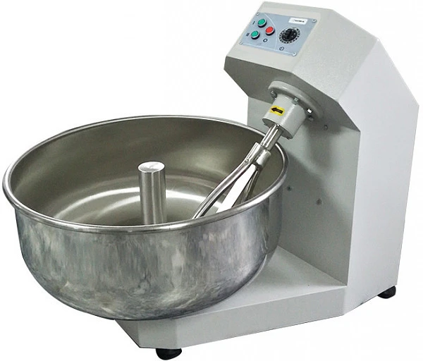 Тестомес оснащен кнопочной панелью управления, таймером на 30 минут, разделительным цилиндром в центре чаши и прямоугольным бруском в середине венчика.