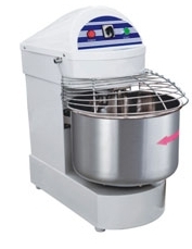В вертикальном тестомесе, еще его называют спиральный, одновременно вращается дежа с тестом и месильное устройство.