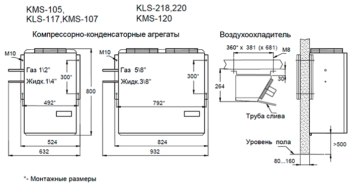 Габариты в упаковке, мм: Конденсатор: 800х550х1040 / Воздухоохладитель: 600х700х500