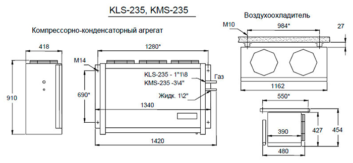 Габариты в упаковке, мм: Конденсатор: 1580х560х1130 / Воздухоохладитель: 1310х710х770
