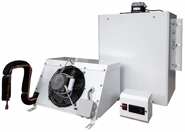 Модель оснащена компрессорно-конденсаторным блоком и воздухоохладителем, соединенными между собой теплоизолированными медными трубками, по которым циркулирует хладагент и выводится конденсат, а также кабелем питания и управления.