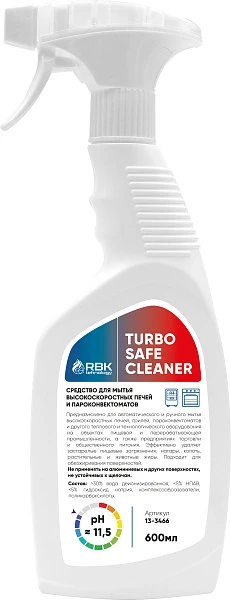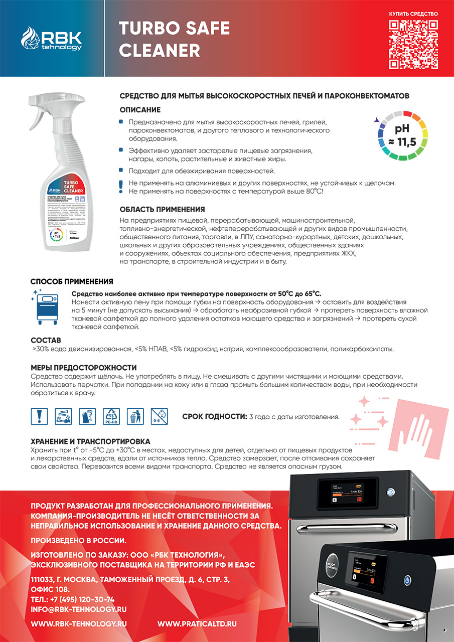 Средство моющее ХимПромЛаб Turbo Safe Cleaner разработано специально для ежедневного ухода за высокоскоростными печами Pratica (Бразилия) и другим тепловым оборудованием (пароконвектоматами, конвекционными печами, жарочными поверхностями, грилями и т.п.) Густая активная пена эффективно расщепляет и удаляет стойкие пригоревшие жировые и белковые загрязнения, нагар, копоть и т.п. Средство быстро и качественно борется с загрязнениями и легко смываются водой.