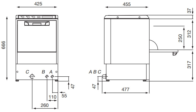 Внимание! Данная модель не комплектуется сливной помпой. Установка посудомоечной машины должна быть выше уровня канализационного отверстия (установка на столе или подставке). В таком случае, вода будет сливаться самотеком. Если же машина устанавливается на уровне слива, под барную стойку, то рекомендуется использовать только модели со сливной помпой.