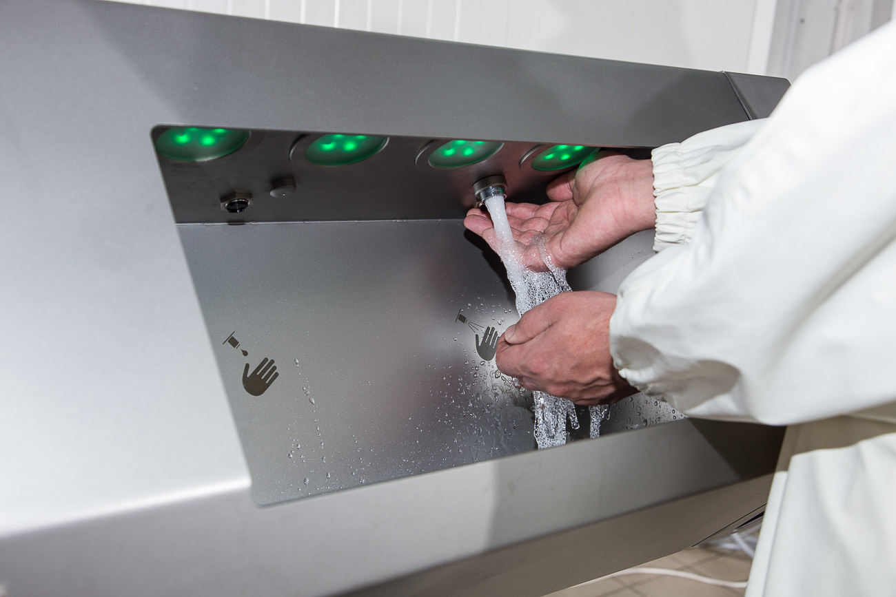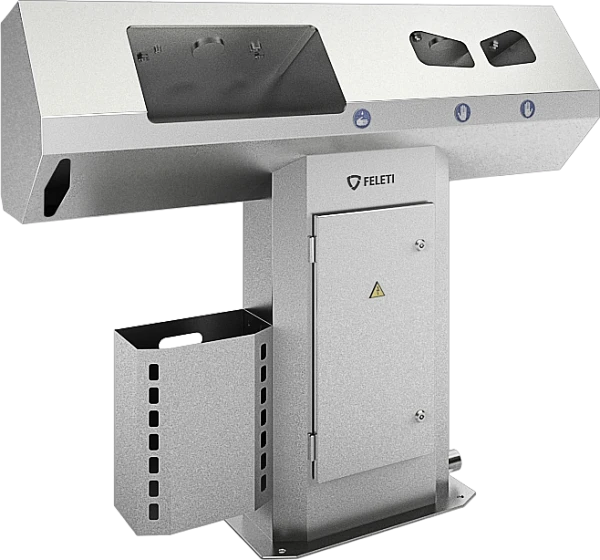 Станция гигиены рук Feleti SR-2 предназначена для автоматической бесконтактной обработки кистей рук персонала перед входом в санитарную зону. Станция гигиены рук SR-2 состоит из модуля мойки и модуля дезинфекции рук.